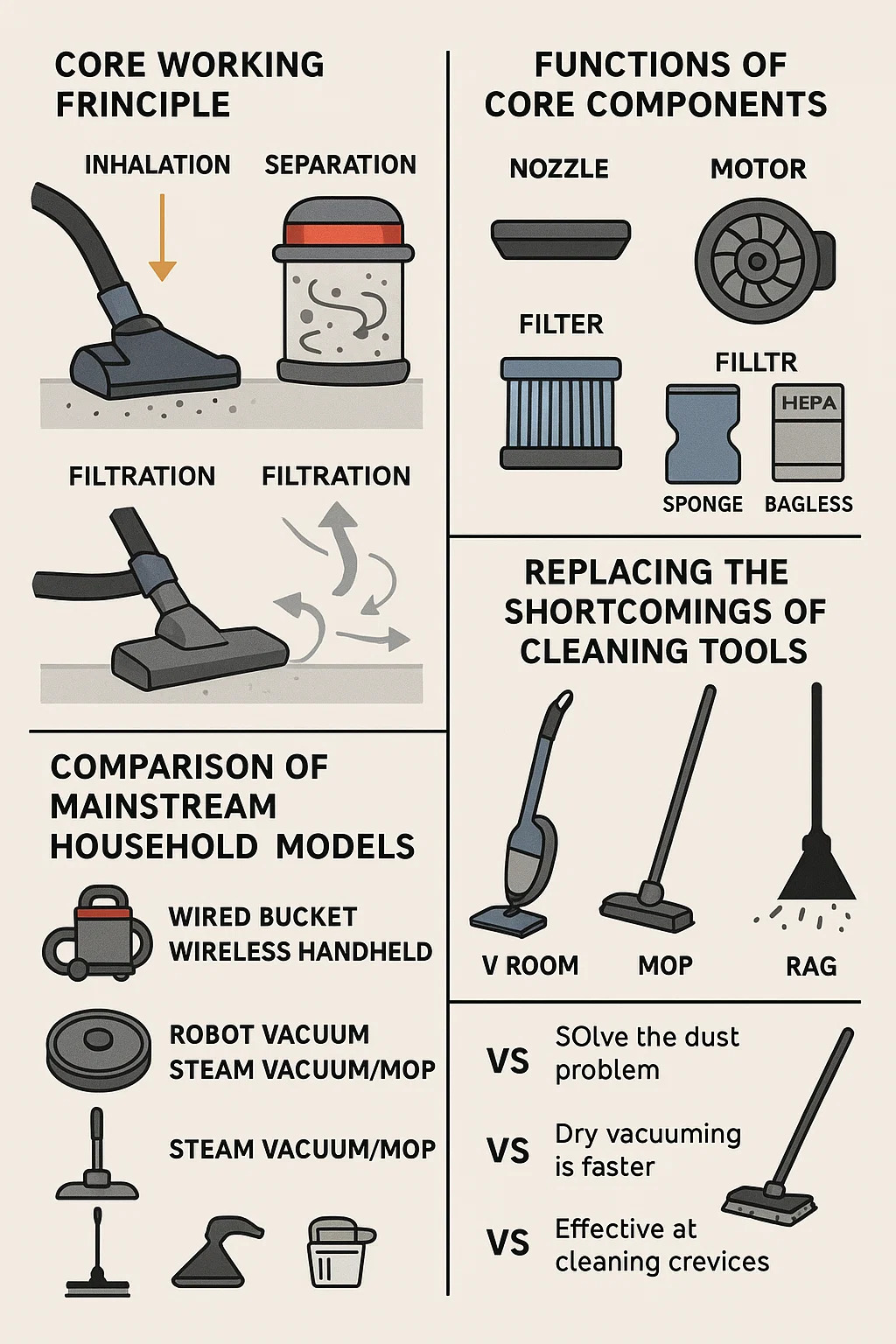 العمليات الرئيسية: ▶ الاستنشاق - يدور المحرك ، مما يخلق منطقة منخفضة الضغط. الهواء ، حمل الغبار ، يندفع إلى فوهة الشفط. ▶ الفصل - يدور خليط الهواء الغبار داخل سلة الغبار ، مما تسبب في سقوط جزيئات ثقيلة في صندوق جمع الغبار ؛ ▶ الترشيح - يتم احتجاز الغبار الناعم بواسطة المرشح ، ويتم تفريغ الهواء النظيف من الخلف.